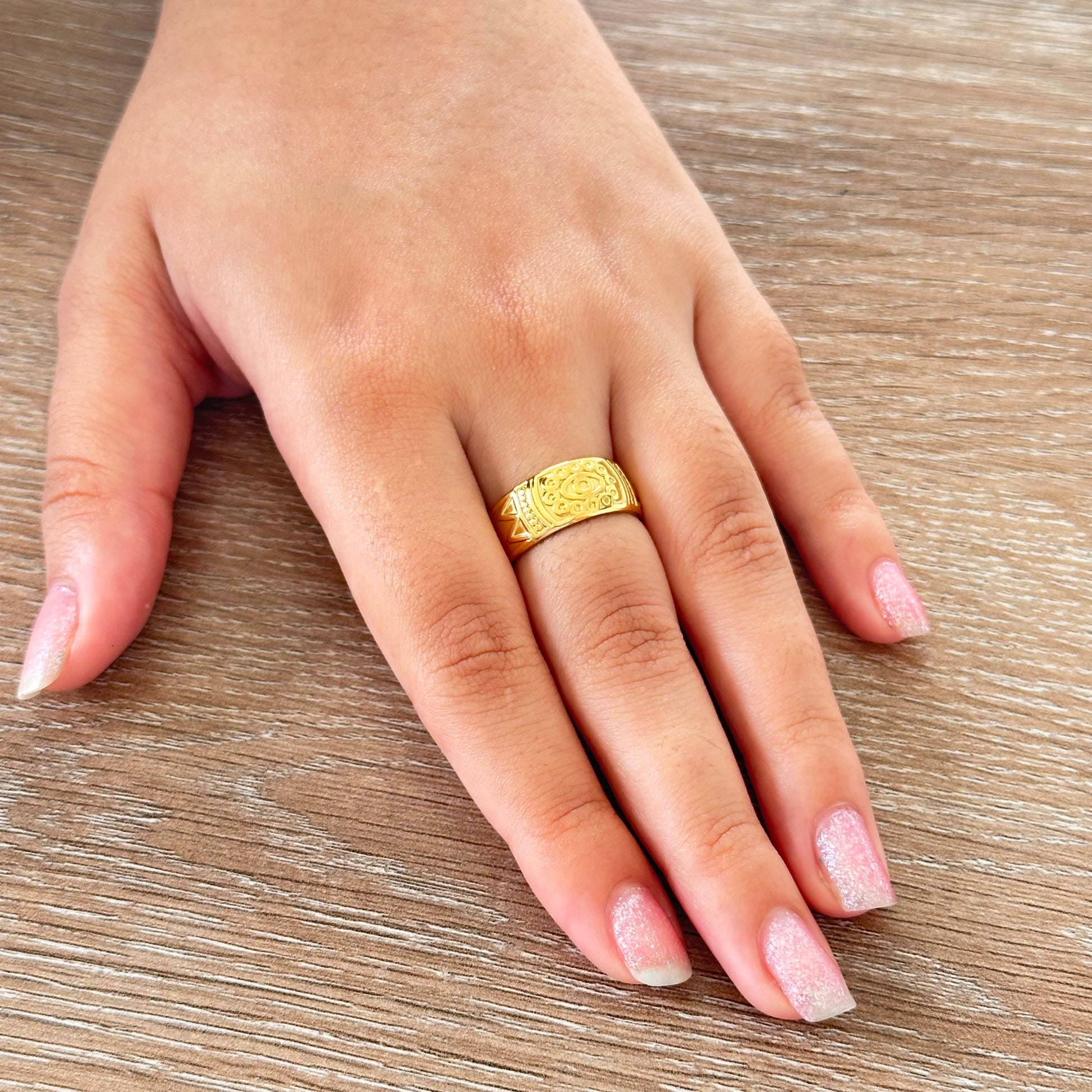 Anillo meticulosamente elaborado en acero quirúrgico de alta calidad, garantizando durabilidad excepcional y resistencia a la corrosión. Su diseño detallado ofrece un acabado sofisticado mientras el material hipoalergénico lo hace ideal para pieles sensibles. Mantiene su brillo original con mínimo mantenimiento.